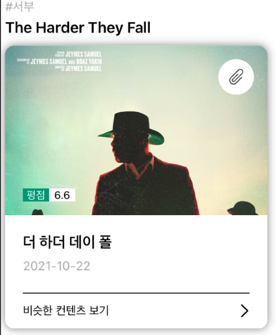 셀을 눌렀을 때에는 배우 정보가 나오지만, 비슷한 컨텐츠 보기를 눌렀을 때에는 같은 장르의 영화들이 나온다. 'iOS > Swift' 카테고리의 다른 글