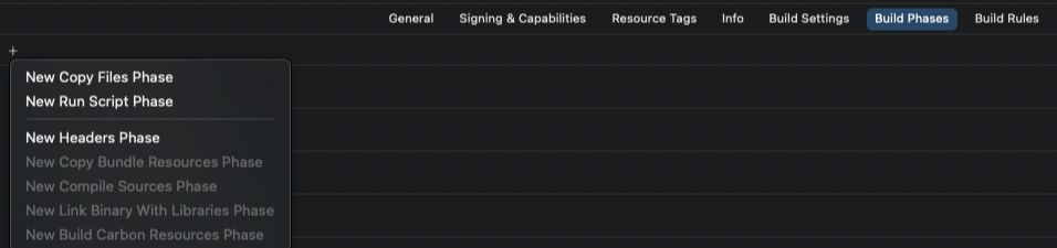 그리고 Build Phases 탭으로 이동한 뒤, + 버튼을 누르고 Run Script Phase를 추가해준다.