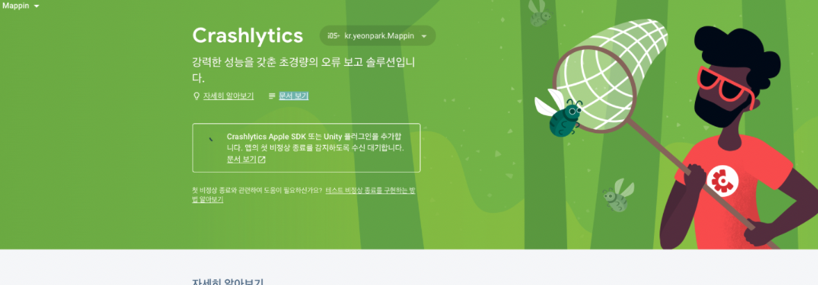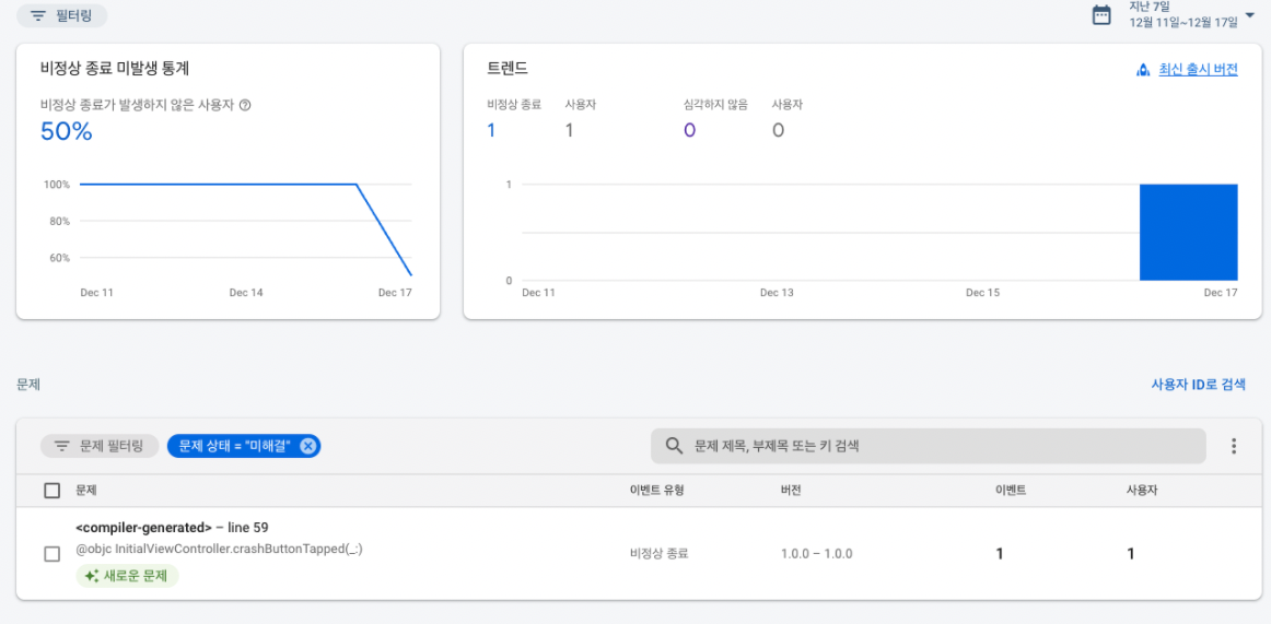 몇분 정도 뒤 Firebase 콘솔의 Crashlytics 대쉬보드로 들어가보면
